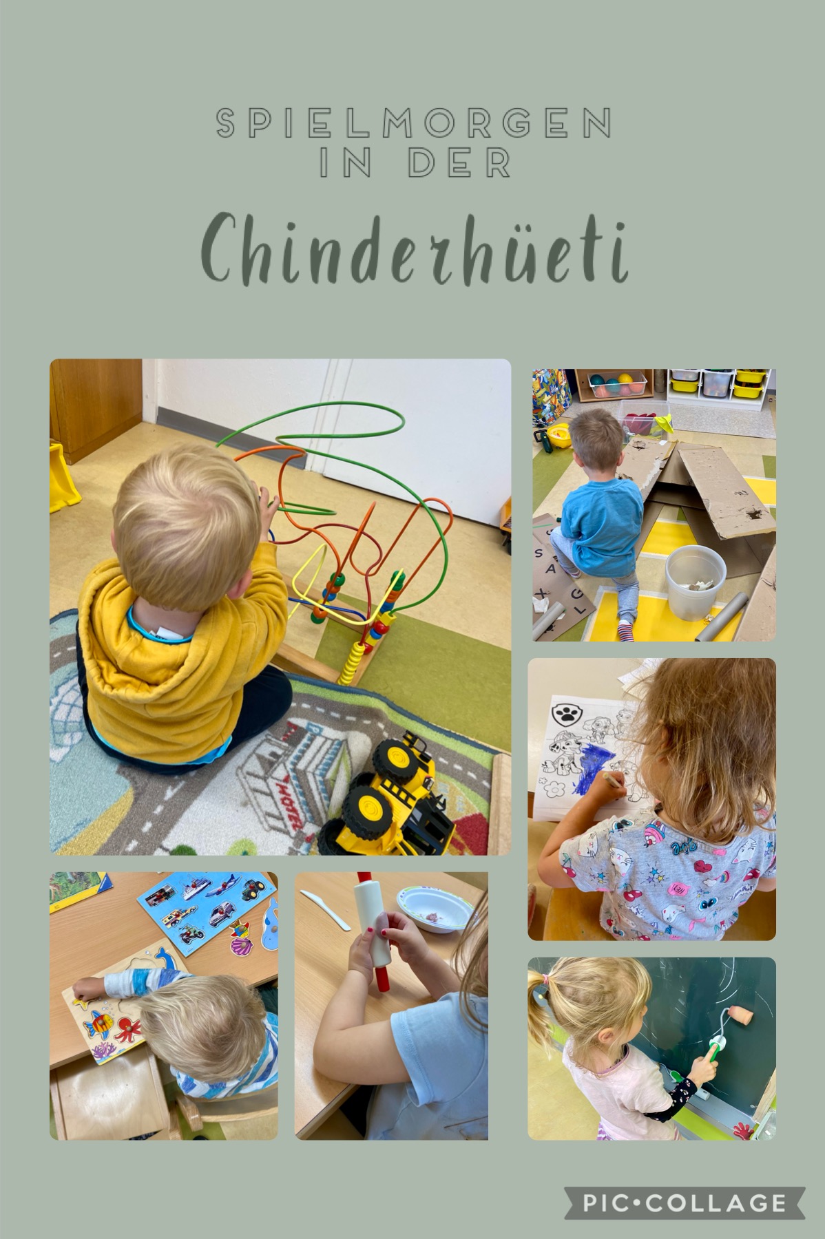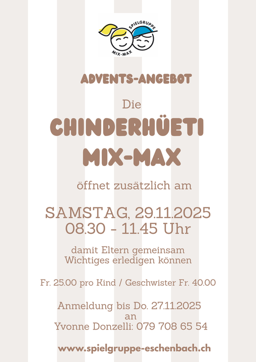 Jede Woche findet in den Räumlichkeiten der Spielgruppe MIX-MAX unter fachkundiger 2er-Leitung unsere "Chinderhüeti" statt. Sie ist für Vorschulkinder von ca. 2 - 5 Jahren gedacht. Hier können die Kinder ungezwungene Spielstunden mit Gleichaltrigen verbringen und bereits etwas "Spielgruppenluft" schnuppern oder ein weiteres Mal geniessen!